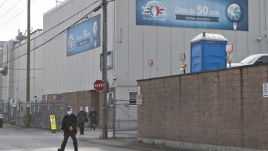 INCLUDES CORRECTION Workers walk outside the Olymel pork processing plant, on Oct. 29, 2020 in Vallee-Jonction, Que.JACQUES BOISSINOT/THE CANADIAN PRESS…